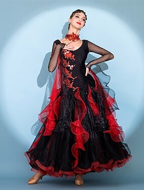 Vestido de dança de salão feminino, preto, vermelho, bordado de chamas, babados, organza, tango, foxtrot, paso doble, competição, vestido de apresentação
