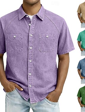 Homens Camisa Social Camisa casual camisa de botão Camisa Acid Wash 100% Algodão Preto Verde Claro Roxo Caqui Verde Tropa Manga Curta Tecido Colarinho de Camisa Casual Diário Bolso frontal Roupa