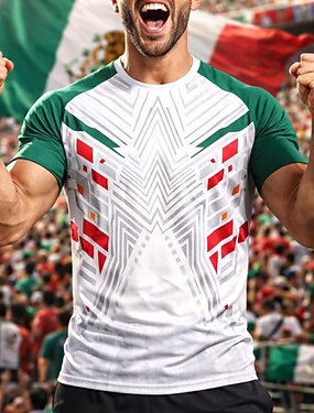 Camisa de futebol masculina, modelo México, branca com mangas verdes e estampa geométrica vermelha, em malha respirável com proteção solar UPF50+, ideal para torcedores em torneios.