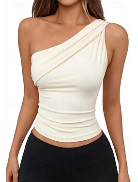 Mulheres Camiseta Pregas Côr Sólida Elegante à moda quente Sem Manga Assimétrico Tops curtos Para Noite Roupas de férias Roupas para encontros noturnos Preto Marfim Verão Primavera