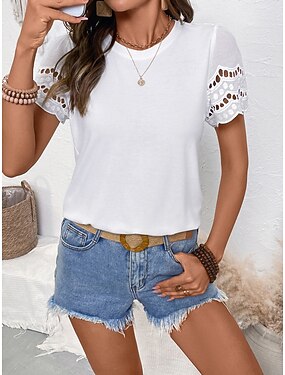 Mulheres Camiseta Frufru Patchwork Com Corte Gráfico Tecido Clássico Casual Manga Curta Gola Redonda Decote Redondo Tops regulares Diário Para Noite Branco Verão Primavera