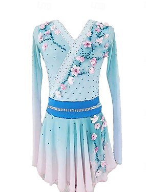 Vestidos para Patinação Artística Mulheres Patinação no Gelo Vestidos Azul+Rosa Patchwork Thumbhole Com Stretch Treino Competição Roupa para Patinação Clássico Cristal / Strass Manga Longa Patinação