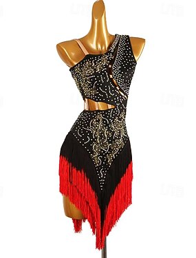Vestido de dança latina feminino preto com franjas vermelhas, manga comprida e strass para competição de salão de baile.