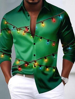 Natal Homens Cor gradiente Luz de Natal Enfeites de Natal Camisa Social Blusa de cetim Saia Manga Longa Moda Casual Festa Feriado Primavera Outono Aberto para a Lateral Impressão 3D Camisas de botões