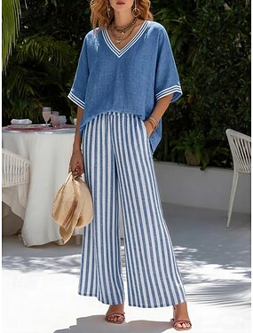 Mulheres Conjuntos de calças Linho de algodão sintético Manga Curta Decote V Gráfico Listrado Moda Roupa de rua Casual Diário Ao ar livre Azul Preto Vermelho Primavera Verão Ajuste Largo