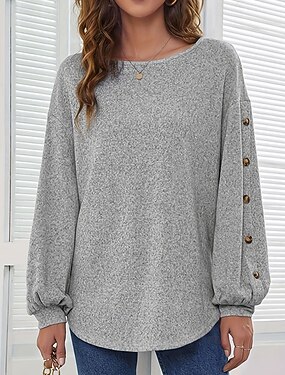 Mulheres Camiseta T-shirt Botões Tecido Moda à moda Clássico Manga Longa Decote Redondo Tops regulares Diário Para Noite Final de semana Cinzento Primavera Outono