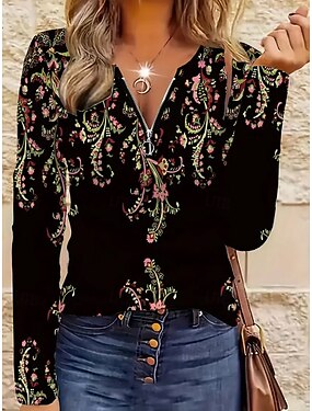 Mulheres Camiseta Zíper Imprimir Gráfico Plantas Moda Casual Manga Longa Gola Redonda Tops regulares Diário Preto Primavera Outono Inverno