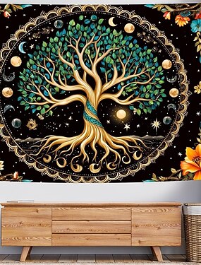 Tapeçaria de parede em mosaico com vitral representando a árvore da vida, colorida e vibrante, ideal para decoração de sala de estar e quarto. Pôster grande em tecido.