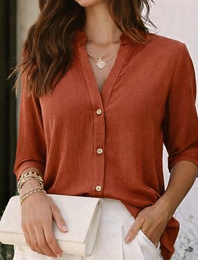 Mulheres Camisa Social Camisa casual camisa de botão Linho de algodão sintético Côr Sólida Tecido Férias Moda Casual Meia Manga Decote V Tops regulares Streetwear Praia Feriado Tijolo vermelho Verão