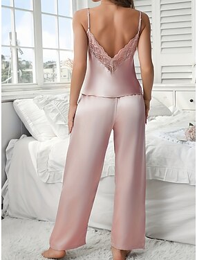 Mulheres Pijamas Conjunto de Pijama Simples Casual Cor imaculada Renda Cintura elástica Calça Diário Casa Férias Sem Manga Correias Preto Rosa Vermelho Bege Verão Primavera Normal