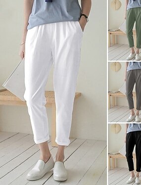 Mulheres Linho de algodão sintético chinês Calça verão Reto Férias Básico Casual Mimolet Cintura Alta Tecido Bolsos Cintura elástica Confortável Macio Micro-Elástica Diário Ao ar livre Rua Preto