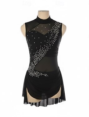 Vestidos para Patinação Artística Mulheres Para Meninas Patinação no Gelo Vestidos Preto Patchwork Barra Assimétrica Com Transparência Elasticidade Alta Treino Competição Roupa para Patinação