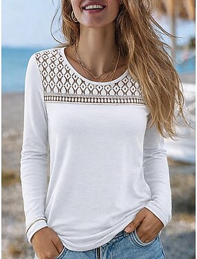 Mulheres Blusa Renda Patchwork Côr Sólida Ativo à moda Casual Manga Longa Gola Redonda Tops regulares Diário Branco Primavera Outono