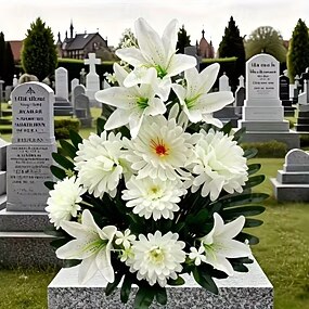 Arranjo de flores artificiais para cemitério, ideal para o Dia da Memória, com folhas extragrandes de palmeira areca verde e lírios brancos. Resistente aos raios UV, perfeito para uso externo e também