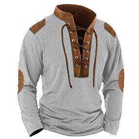 Homens Camisa Waffle Camiseta T-shirt Camisa de manga longa Manga Longa Colarinho Primavera & Outono Bloco de cor Vintage Designer Básico Cordões Patchwork Estilo vintage Férias Rua Para Noite Preto