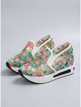 Tênis slip-on feminino verde floral em tela – calçado plataforma leve e respirável para caminhadas, viagens e jardinagem. &uso diário