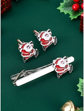 Conjunto de abotoaduras e prendedor de gravata masculino com tema natalino do Papai Noel – material em liga metálica, design festivo para festas de fim de ano e ocasiões formais.