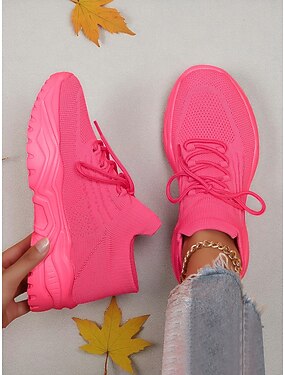 Tênis femininos Flyknit vermelho com solado robusto – calçados esportivos respiráveis com cadarço para uso casual e treino na academia