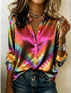 Mulheres Camisa Social Blusa de cetim Imprimir Gráfico Tintura Tie Dye Boêmia Vintage Moda Manga Longa Colarinho de Camisa Tops regulares Diário Feriado Para Noite Fúcsia Laranja Verão Primavera