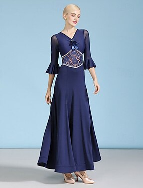Vestido de dança de salão feminino azul marinho com detalhe em renda na cintura, decote em V e mangas com babados, estilo valsa, modelo moderno e clássico para competições.