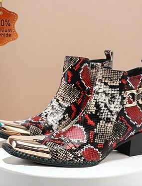 Botas masculinas de couro com estampa de cobra vermelha e preta – botins exóticos de bico fino com biqueira de metal para casamentos, festas de Gatsby e trajes de noite