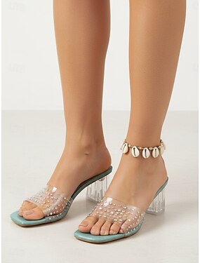 Sandálias mule femininas com strass transparente - elegantes sandálias de salto bloco transparente com bico quadrado, perfeitas para eventos noturnos, festas em resorts e cruzeiros. &eventos formais