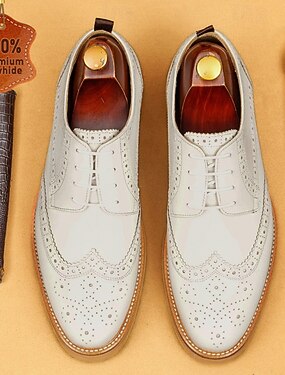 Sapatos Oxford masculinos premium em couro legítimo branco, modelo brogue clássico com cadarço, ideais para noivos, padrinhos, casamentos, banquetes e ocasiões formais de negócios.