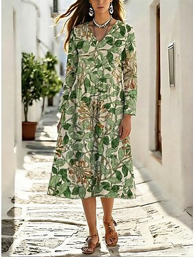 Mulheres Vestido Longo Linho de algodão sintético Vestido de turno Casual Diário Normal Floral Manga 3/4 Decote V Amarelo Verde Cinzento Primavera Outono