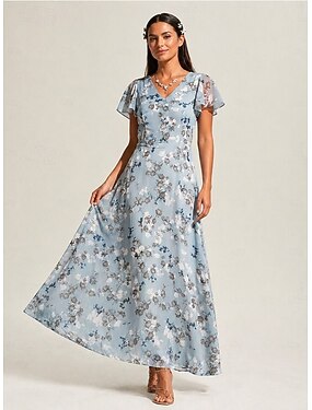 Mulheres Vestido midi Vestido A Line Elegante Mangas Evasê Diário Férias Convidado do casamento Cordões Frufru Normal Floral Manga Curta Decote V Cinza celeste