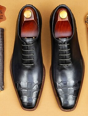 Sapatos Oxford masculinos premium em couro legítimo preto com textura de crocodilo, modelo wholecut, com cadarço, para ocasiões formais como casamentos, recepções e eventos masculinos. Estilo elegante e sofisticado.