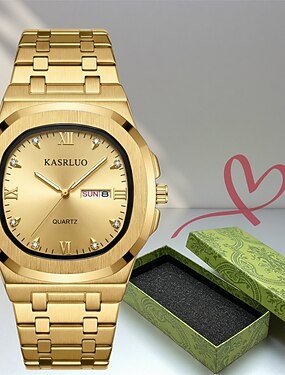 Relógio masculino de luxo em ouro, relógio de pulso de quartzo para negócios com dia e data, relógio analógico com numerais romanos em aço inoxidável dourado com caixa de presente, elegante e à prova