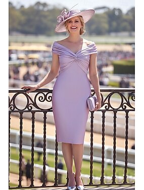 Tubinho Até os Joelhos Vestido de Derby Vestido Para Mãe dos Noivos Manga Curta Decote V Ombro a Ombro Elegante Vintage Minimalista Kentucky Derby Cetim com Franzido Cor Única