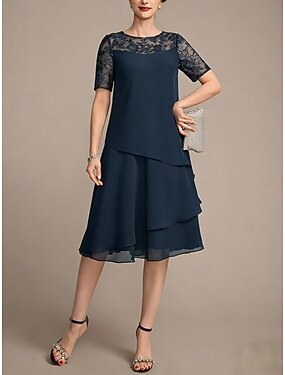 Mulheres Vestido no Joelho Vestido de chiffon Vestido de renda Vestido casual Elegante Moda Moderno Ao ar livre Férias Festa Normal Tecido Manga Curta Gola Redonda Azul Champanhe Vinho Azul Marinha