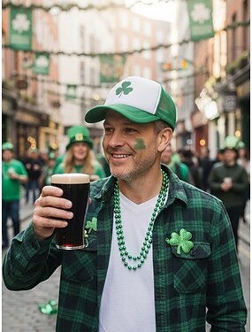 verde masculino para o dia de São Patrício &Boné branco com tela na parte de trás e trevo – boné estiloso para festas e celebrações.