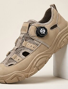 Sandálias esportivas masculinas bege com fecho de velcro, modelo fechado em tela para o verão, confortáveis para atividades ao ar livre, ideais para férias na praia, aventuras em ilhas e caminhadas de lazer.