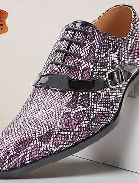 Sapatos Oxford masculinos de luxo em couro legítimo roxo com estampa de pele de cobra, detalhe de fivela e cadarço, ideais para negócios, casamentos, banquetes, escritório e ocasiões formais. Perfeitos para cavalheiros elegantes.