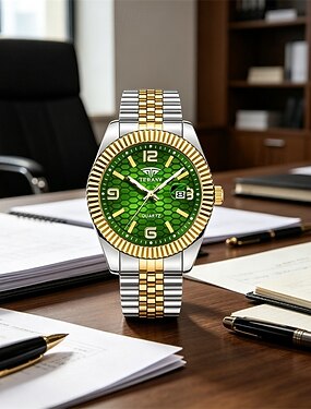 Relógio masculino de quartzo, mostrador verde, pulseira bicolor em aço inoxidável dourado, bisel canelado, relógio social casual com janela de data, relógio de pulso luminoso à prova d'água para
