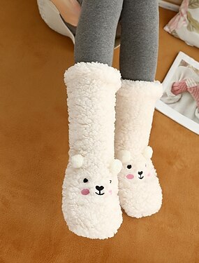 Meias de inverno de lã macia e aconchegante para mulheres, meias pantufa grossas e confortáveis para usar em casa, meias de dormir fofas com estampa de urso e forro de sherpa, macias e