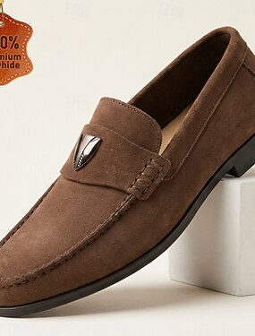 Mocassins masculinos de camurça marrom com detalhe metálico, confortáveis e feitos de couro premium, calçados casuais estilosos para o escritório, trabalho e ocasiões informais.