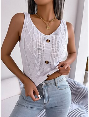 Mulheres Tops tricotados em costura Malha Íntima T-shirt Botões Côr Sólida Moda à moda Clássico Sem Manga Decote V Tops regulares Tops curtos Diário Para Noite Final de semana Branco Rosa Cáqui Verão