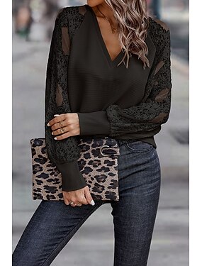 Mulheres Tops tricotados em costura Top de emenda de renda Renda Bordado Com Transparência à moda Casual Manga Longa Decote V Tops regulares Diário Para Noite Marron Escuro Preto Azul empoeirado Verde