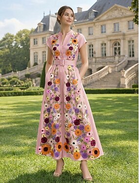 Linha A Até o Tornozelo Longuette Vestidos de cocktail Elegante Vintage Floral Manga Curta Ombro a Ombro Festa de Jardim Casamento Bolsos Cetim Renda com Estampa floral Flor bordada Bordado