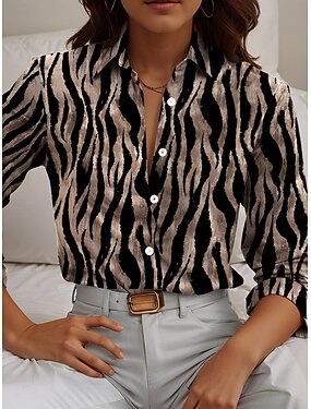 Camisa Feminina Linho Semelhante Respirável Leve Animal Geométrico Casual Manga Longa Colar Tops Regulares Trabalho Diário Botões Estampa Preto Primavera Outono Inverno