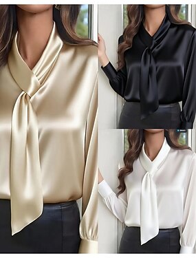 Mulheres Blusa de cetim Saia Blusa Franzido Côr Sólida Elegante à moda Trabalho Manga Longa Gravata no pescoço Gola Alta Tops regulares Diário Escritório Trabalho Preto Branco Cáqui Primavera Outono