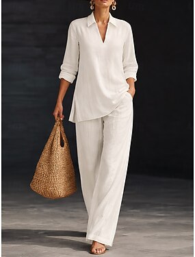 Mulheres Conjuntos de linho de algodão Conjuntos de duas peças Blusa Sem Manga Manga Longa Gola Redonda Decote V Côr Sólida Tecido Elegante Moda Roupa de rua Casual Diário Ao ar livre Preto Branco