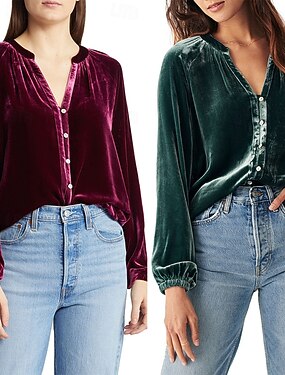 Mulheres Camisa Social Veludo Elegant Elegante Franzido Botões Côr Sólida Elegante à moda Casual Manga Longa Decote V Tops regulares Diário Trabalho Feriado Vinho Verde Tropa Primavera Outono