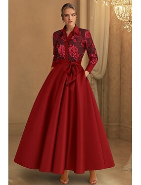 Linha A Longo Até o Tornozelo Vestidos de noite Vestido de Baile Vestido formal Elegante Brilhante Sedoso Manga Longa Colarinho de Camisa Casamento Formal Bolsos Cetim Cetim Elástico com Laço(s