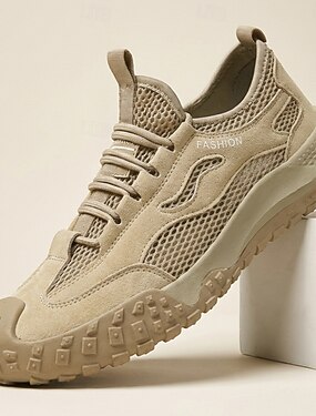 Tênis masculino bege para atividades ao ar livre, com cadarço, respirável, leve e confortável, ideal para caminhadas, viagens, camping, trilhas, aventuras ao ar livre e para o dia a dia.
