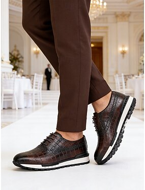 Tênis social masculino em couro marrom – design clássico com cadarço, couro premium e sola confortável, perfeito para casamentos, eventos de negócios e uso casual.