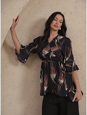 Mulheres Camisa Social Túnica Blusa gravata na frente Elegante Manga 3/4 Mangas Evasê Decote V Diário Convidado do casamento Preto Verão Primavera Outono